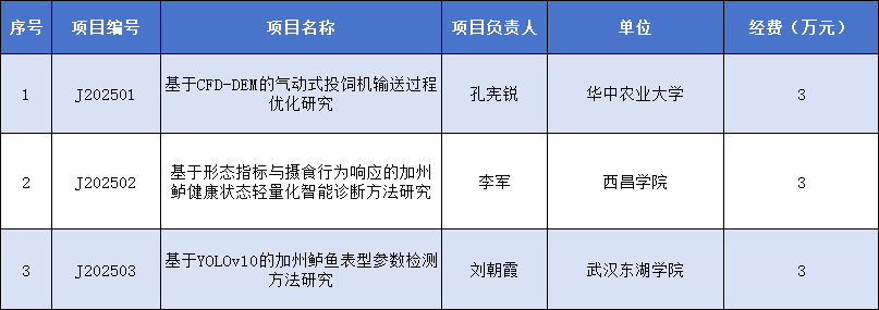 根據(jù)《水產(chǎn)養(yǎng)殖智能化設備設計與制造福建省高等學校應用技術工程中心(簡稱“工程中心”)2025年度開放基金課題申報指南》的通知要求,經(jīng)個人申報、“工程中心”初審、專家評審,擬立項以下3個項目為“工程中心”2025年度開放基金課題,特此公示。