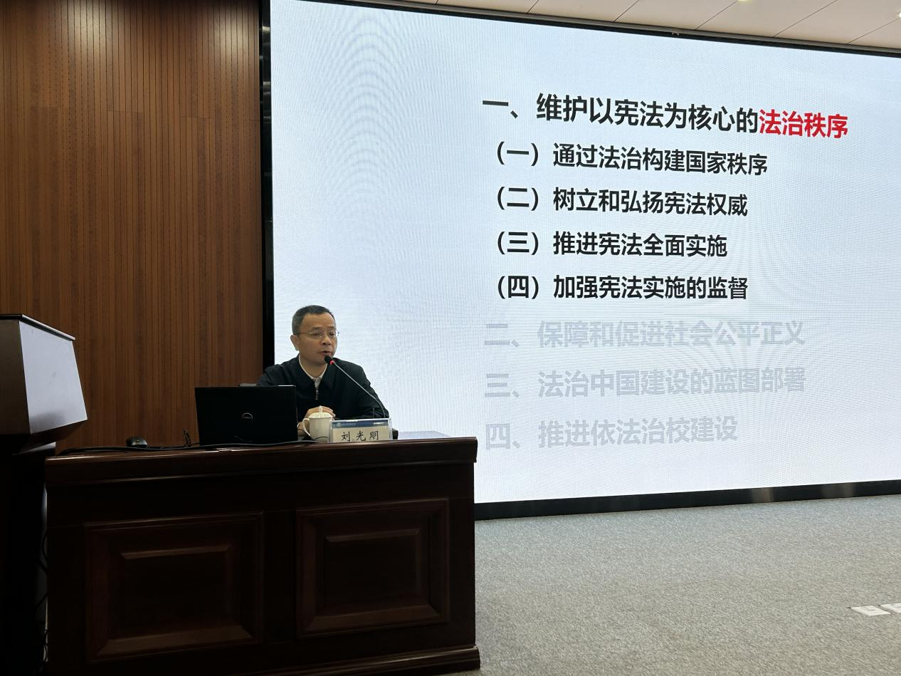 12月4日,是我國第十二個(gè)國家憲法日。為深入學(xué)習(xí)貫徹黨的二十屆四中全會精神和習(xí)近平法治思想,推動全面依法治國重大決策部署在我校落地和落實(shí),院長劉光明在翔安校區(qū)T2報(bào)告廳以《以習(xí)近平法治思想推進(jìn)依法治校建設(shè)》為題作“學(xué)習(xí)貫徹黨的二十屆四中全會精神”專題報(bào)告。發(fā)展規(guī)劃與質(zhì)量管理處、黨政辦公室、人事處、學(xué)生工作部、安全處、后勤處等部門代表,馬克思主義學(xué)院教師、海洋文化與旅游學(xué)院師生代表共計(jì)120余人參會。報(bào)告會由馬克思主義學(xué)院盧銀霞老師主持。